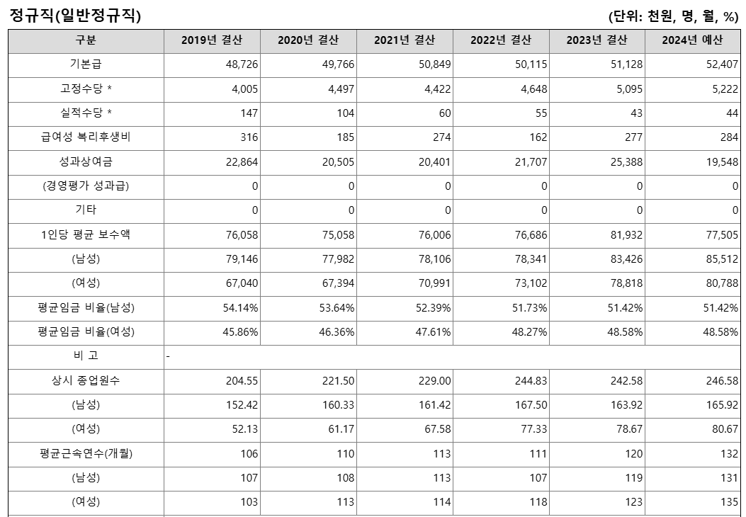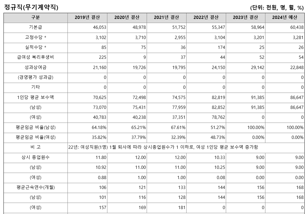 재미있는 것은 무기계약직의 평균연봉이 더 높다는 점이다. 아마도 전문계약직의 비중이 높기 때문이 아닐까 생각된다. 2023년 기준 무기계약직의 평균연봉은 9138만원이다. 남성직원만 있고, 여성직원은 없다. 이들의 평균 근속연수는 156개월이다. 일반 정규직 직원들보다 근속연수가 긴편이다.