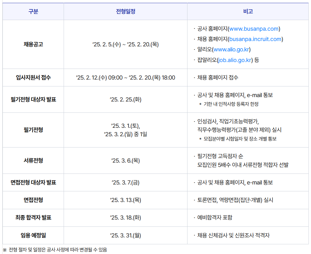 선발은 필기와 서류전형, 면접전형을 거쳐 임용된다. 입사원서접수는 2월 12일부터 20일(오후 6시)까지다. 필기전형 대상자는 2월 25일 발표되고, 필기전형은 3월 1일과 2일 중 하루를 택해 치러진다. 서류전형은 3월 6일 발표된다. 면접 대상자는 3월 7일 발표되며, 면접전형은 3월 13일 진행된다.