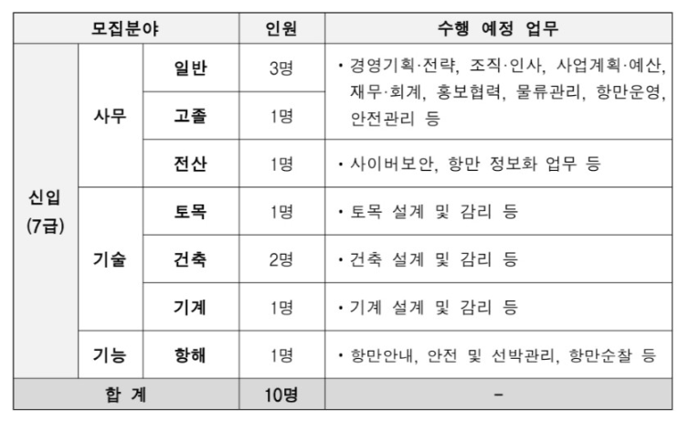 부산항만공사는 이번 채용으로 10명을 선발할 예정이다. 모집분야는 사무, 기술, 기능이다. 사무분야에서는 일반이 3명, 고졸1명, 전산 1명이다. 기술에서는 토목 1명, 건축 2명, 기계 1명을 뽑고, 기능분야에서는 항해 1명을 뽑는다.
