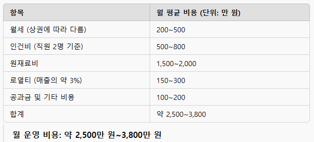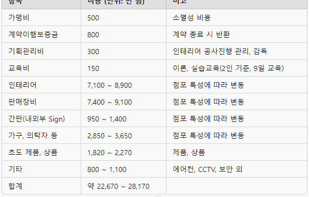 총 예상 창업 비용: 약 2억 2,670만 원 ~ 2억 8,170만 원 (임대료 및 추가 비용에 따라 변동 가능)운영