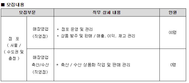 금번 채용의 직급은 인턴사원입니다. 매장영업을 채용하며 축수산 분야 매장영업은 별도 채용입니다. 매장영업은 점포를 운영하고 관리하는 것이고, 상품발주 및 판매와 매출, 이익, 재고관리 등의 직무를 수행하게 됩니다. 축수산 분야는 축수산 상품화 작업 및 판매관리를 수행하게 됩니다. 지원자격은 내년 2월 졸업예정자(올해 10월 입사가 가능한자)입니다. 서울과 수도권, 충청 지역에서 근무하게 됩니다. 9월 20일부터 10월 9일(자정)까지 입사지원서를 접수하면, AI면접(인적성검사0과 면접을 거쳐 합격여부를 가리게 됩니다. 아래 이미지를 클릭하면 채용 사이트로 이동할 수 있습니다.