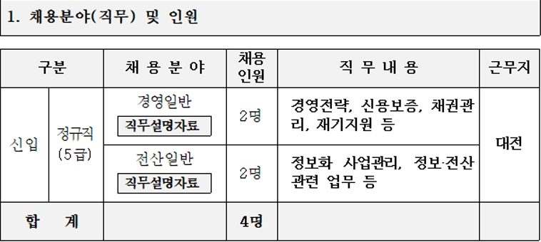 모집부문은 정규직 5급 총 4명입니다. 채용인원이 굉장히 적네요. 경영일반 2명, 전산일반 2명으로 모두 대전에서 근무하게 됩니다. 경영일반의 경우, 경영전략과 신용보증, 채권관리 등의 업무를 맡고, 전산일반직은 정보화 사업관리, 정보전산 관련 업무를 맡게 됩니다.