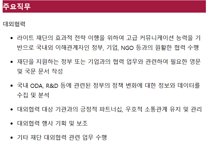 또 국내외 이해관계자와 정부, NGO 등과의 네트워크를 구축하기 위한 경력도 있으면 채용에 유리하겠네요.