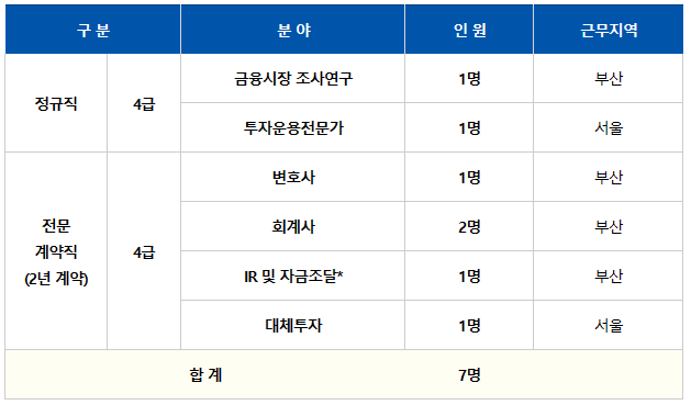 이번 채용에서는 정규직(4급)과 전문계약직(2년 계약, 4급)을 뽑습니다. 모집 분야에 따라 근무지역이 서울과 부산으로 나뉘기 때문에 지원자들은 자신의 모집분야와 근무지역을 잘 확인해야겠습니다. 총 7개 분야에서 7명을 선발하게 됩니다.