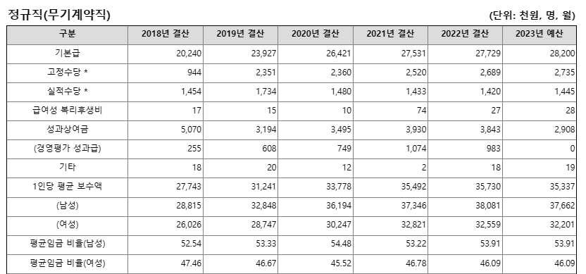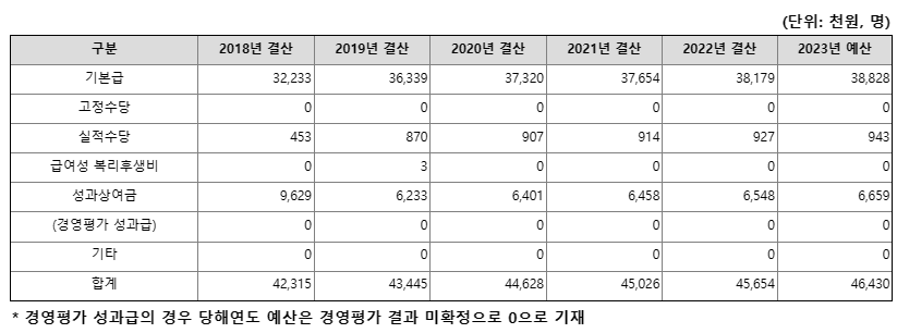 무기계약직의 경우는 연봉면에서 크게 메리트는 없어 보입니다. 2023년 예산 기준으로 남성의 평균 연봉은 3700만 원, 여성 3200만 원으로 1인당 평균 보수액은 3500만 원 수준입니다. 연봉은 중소기업 수준이나 기타 복지 혜택은 받을 수 있고, 공기업이라는 점에서 근무여건은 훨씬 나을 수 있습니다.