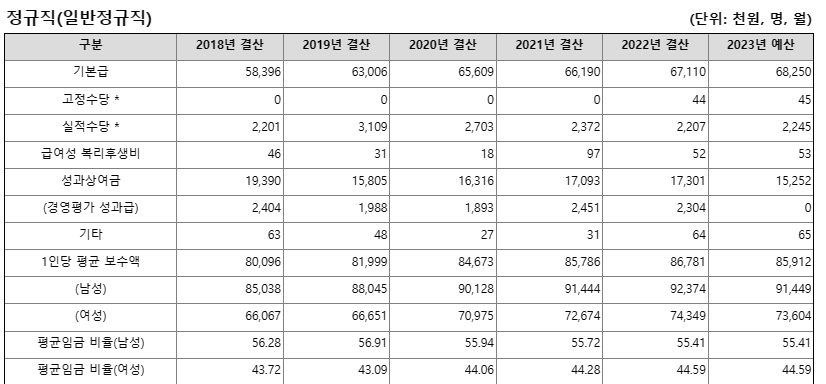 정규직의 평균연봉은 2022년 결산 기준 8600만 원대입니다. 남자는 9200만 원, 여자는 7400만 원 수준입니다. 2023년 예산 기준으로는 남자 9100만 원, 여자 7300만원 등으로 평균 연봉이 9100만원 수준인 것으로 집계됐습니다. 성별 보수의 차이는 근속연수 등에 따른 것으로 남녀의 급여 차등 요인은 없습니다.