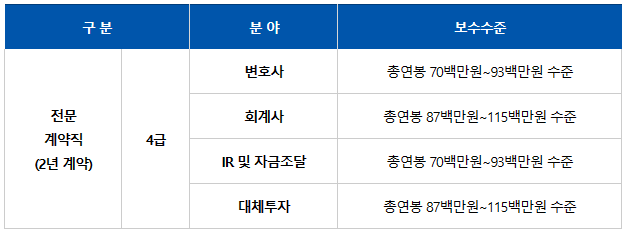 전문계약직의 경우 보수 수준이 일반과 좀 다릅니다. 2년 계약직이며 4급으로 채용되지만 보수는 최소 7000만 원 후반에서 1억 원 초반에서 결정될 예정입니다. 변호사는 7000만 원에서 9300만 원 수준, 회계사는 8700만 원에서 1억 1500만 원, IR및 자금조달 분야는 7000만원에서 9300만원 수준, 대체투자는 8700만원에서 1억1500만원 수준에서 결정됩니다.