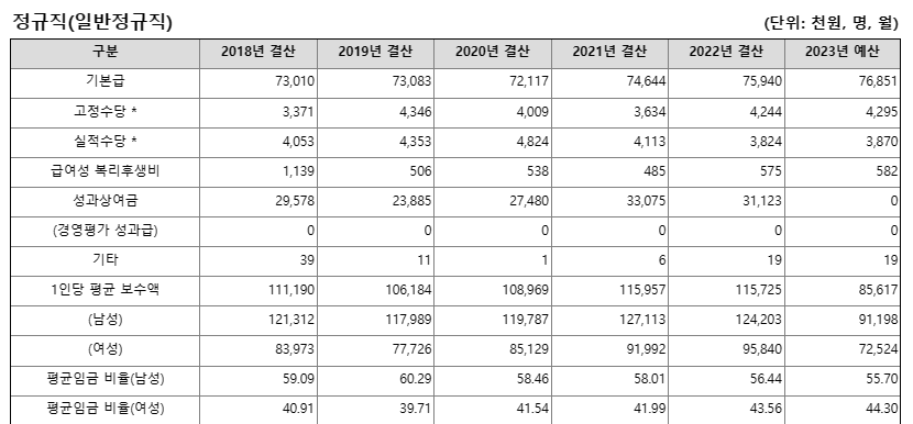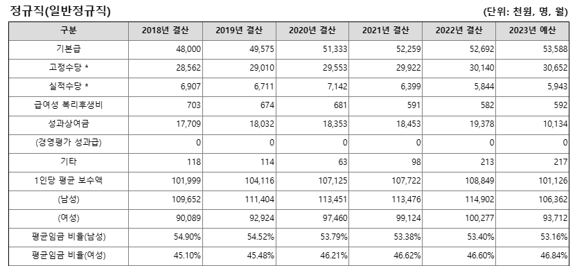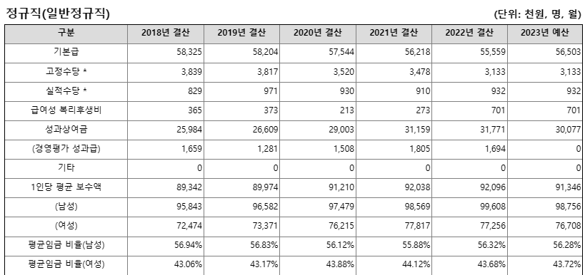 평균 연봉의 경우 2022년 기준으로 남성 1억 2400만 원, 여성 9500만 원으로 평균 1억 1500만 원 수준인 것으로 나타났습니다. 평균연봉의 경우에도 2023년에는 예산 기준으로 남성이 9100만 원, 여성 7200만 원으로 평균 8500만 원 수준입니다. 남녀 연봉 차등은 없습니다. 평균 근속연수는 남성 96개월, 여성 90개월입니다.