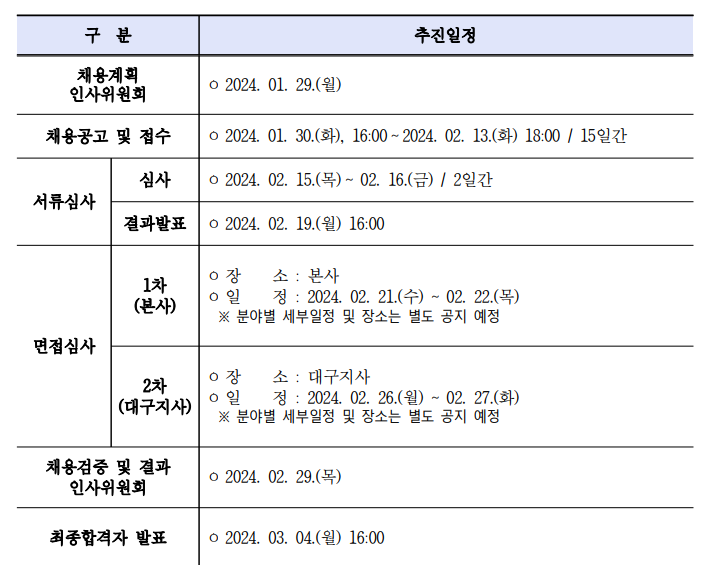 채용 전형은 비교적 간단한 편입니다. 서류전형과 면접전형으로 이뤄지는데요. 면접은 2차로 나눠 진행됩니다. 1차는 본사에서 2월 21일부터 2월 22일 사이에 진행됩니다. 자세한 내용은 아래 표를 참고하시면 됩니다.