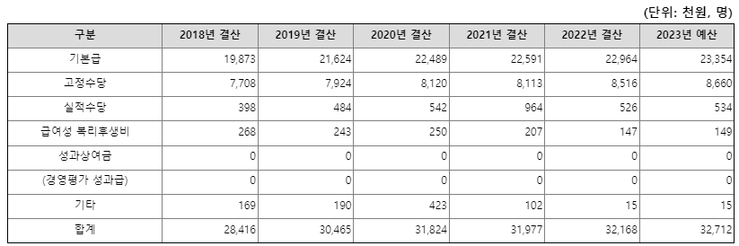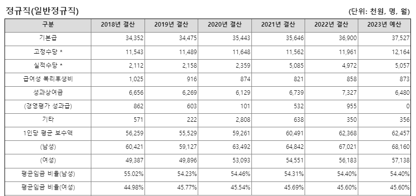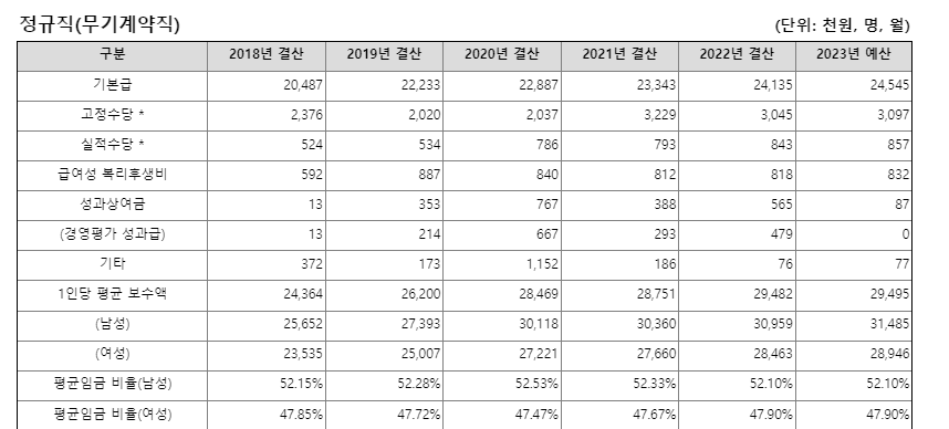 무기계약직의 경우 평균연봉 수준은 더 낮은데 거의 최저임금에 가까운 수준입니다. 2022년 기준 남성은 3000만원, 여성 2800만원으로 평균 연봉 2900만원으로 집계 됐습니다. 2018년에는 평균연봉 2400만원 수준이었으나 매년 100만원에서 200만원 가량 상승한 것이 3000만원 초반대의 연봉입니다.