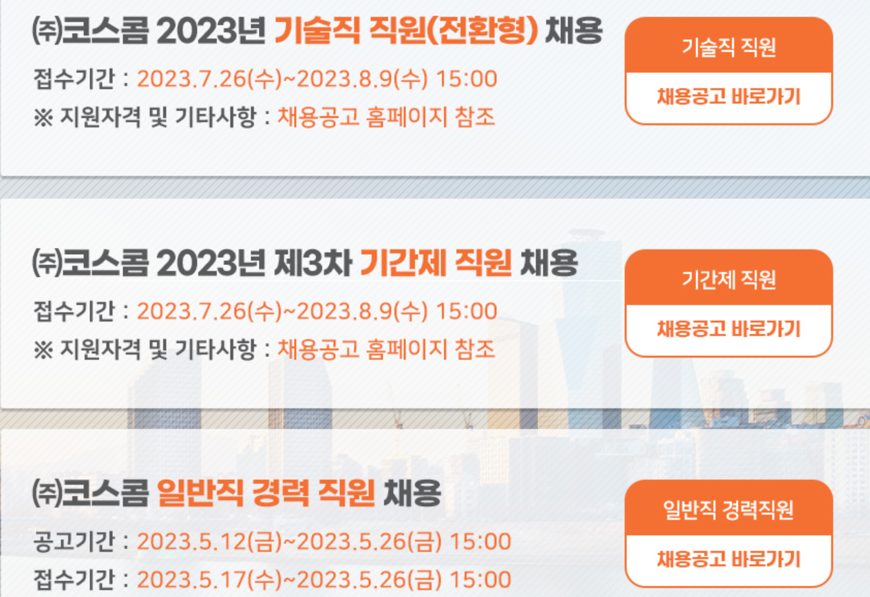 코스콤에서 기술직 직원과 기간제 직원, 일반직 경력직원을 뽑습니다.