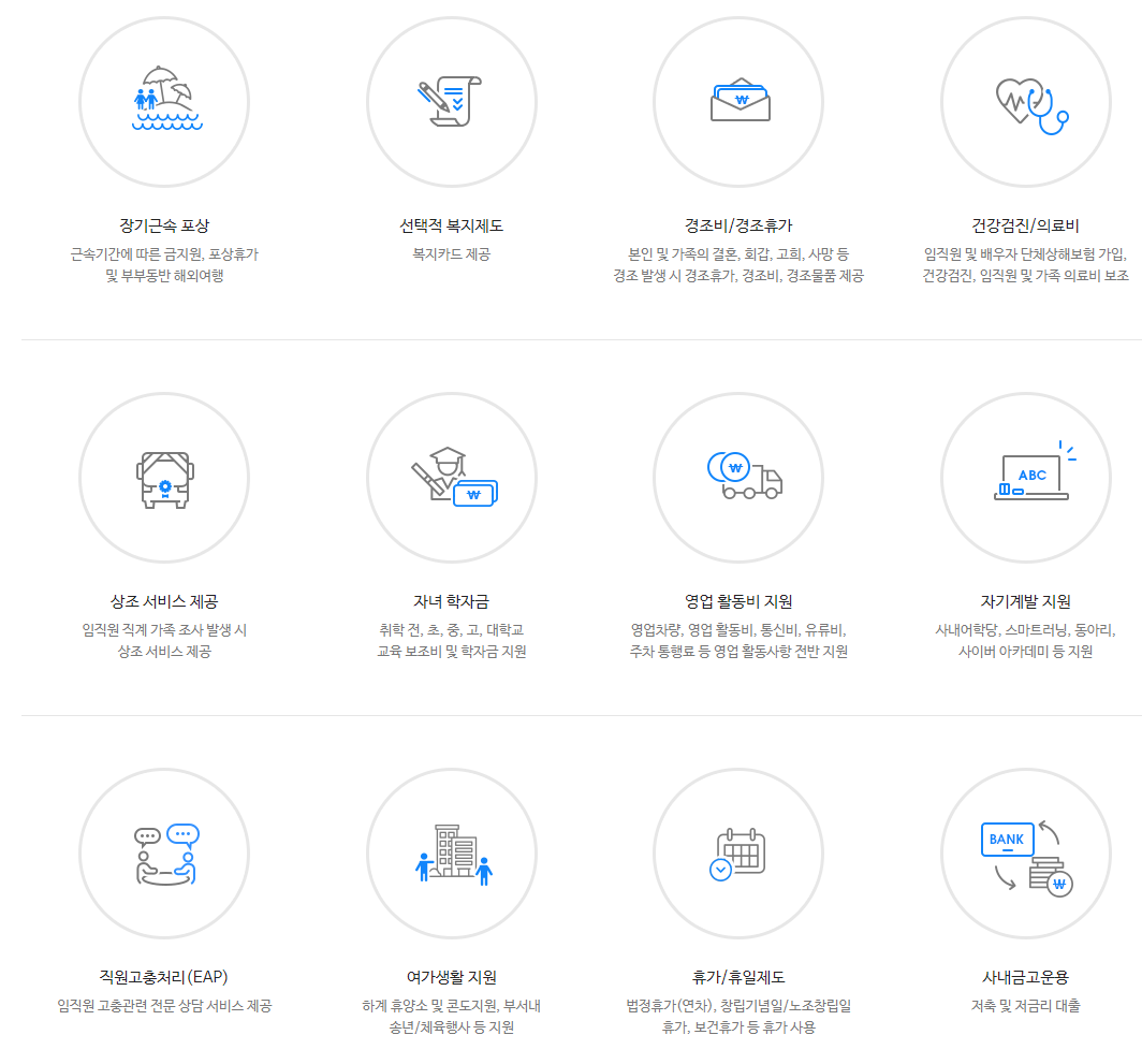 사내에는 어학당과 스마트러닝, 동아리, 사이버 아카데미 등이 지원됩니다. 또 사내금고를 운용해 저금리 대출도 가능합니다. 창립기념일과 노조창립일에는 쉬고, 보건휴가 등의 휴가도 사용할 수 있습니다.