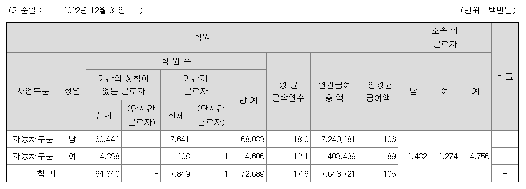 현대자동차의 연봉은 남자 1억 600만원, 여자 8900만 원으로 평균 1억 500만 원 수준입니다. 실수령액 기준 월급이 680만 원에 이르는 금액이네요. 여기에는 기간제 근로자와 생산직 등이 뒤섞여 있습니다. 생산직의 경우 서울 본사보다 급여 수준이 더 높은 것으로 전해지기도 합니다. 다만 대부분의 직원들이 급여와 복지 부문에서 만족하면서 다닐 정도로 높은 수준을 유지하고 있는 것으로 보입니다.