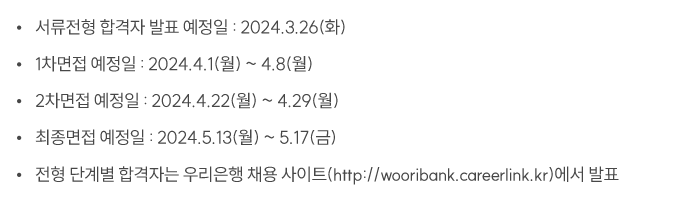 전형절차는 크게 서류전형과 면접전형으로 나뉩니다. 서류전형은 2월 27일부터 3월 13일(오후6시)까지입니다. 우리은행 채용 사이트(위의 이미지 클릭)를 통해 접수를 받습니다. 서류전형 합격자는 3월 26일 발표합니다. 1차 면접은 4월 1일부터 4월 8일까지, 2차 면접은 4월 22일부터 4월 29일까지, 최종면접은 5월 13일부터 5월 17일까지 진행될 예정입니다.