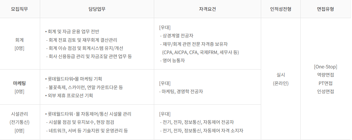 롯데물산이 2024년 3월 신입사원 채용 일반전형을 진행합니다. 회계와 마케팅, 시설관리분야에서 모집합니다. 아래 이미지를 클릭하면 채용사이트로 바로 이동할 수 있습니다.