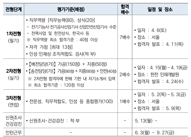 2차전형은 4월 15~19일 치러지며 실기전형입니다. 한전 인재개발원에서 진행되며 4. 월 24일 합격자 발표가 예정돼 있습니다. 마지막으로 면접전형은 5월 2일부터 3일까지 서울에서 진행됩니다.