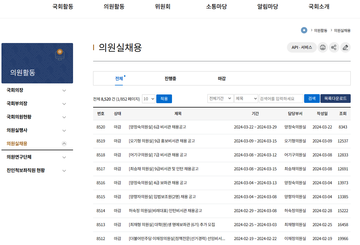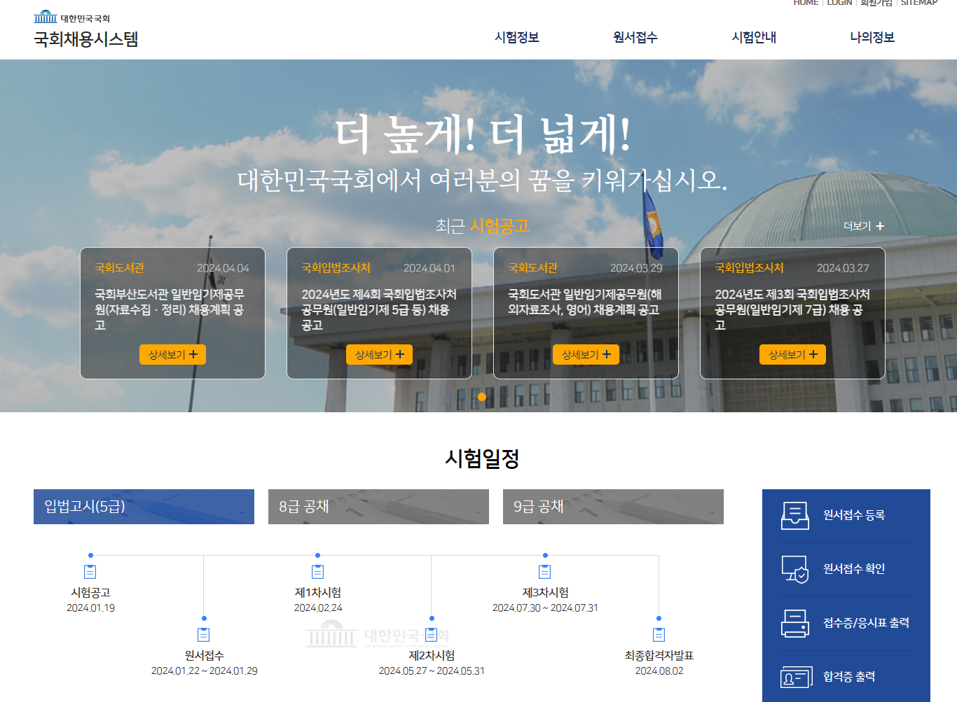입법부는 별도로 뽑는 경우가 많습니다. 입법부 공무원들은 국회 소관 기관인 국회사무처, 국회입법조사처, 국회예산정책처, 국회도서관 등으로 구성되는데 이들은 국회 채용 사이트에 공고가 올라오죠. 물론 이 공고가 인사혁신처의 나라일터에도 동시에 올라오는 경우도 있습니다.