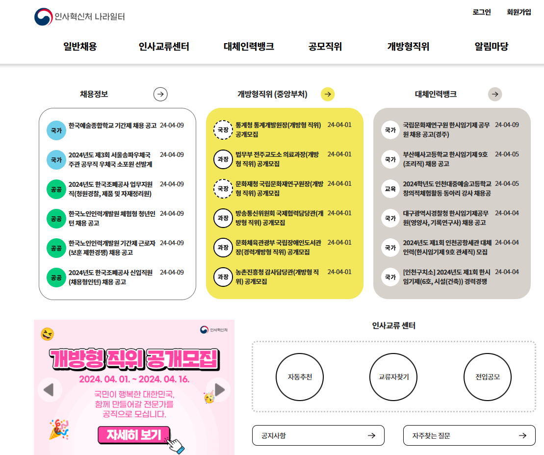 나라일터는 인사혁신처에서 운영하는 플랫폼입니다. 주로 계약직 공무원(일반임기제, 전문임기제 등)과 공무직 채용 공고를 많이 내고 있습니다. 경력에 따라서는 4급 이상 고위 공무원을 채용하는 경우도 있습니다. 이미지를 클릭하면 나라일터로 바로 이동할 수 있습니다.