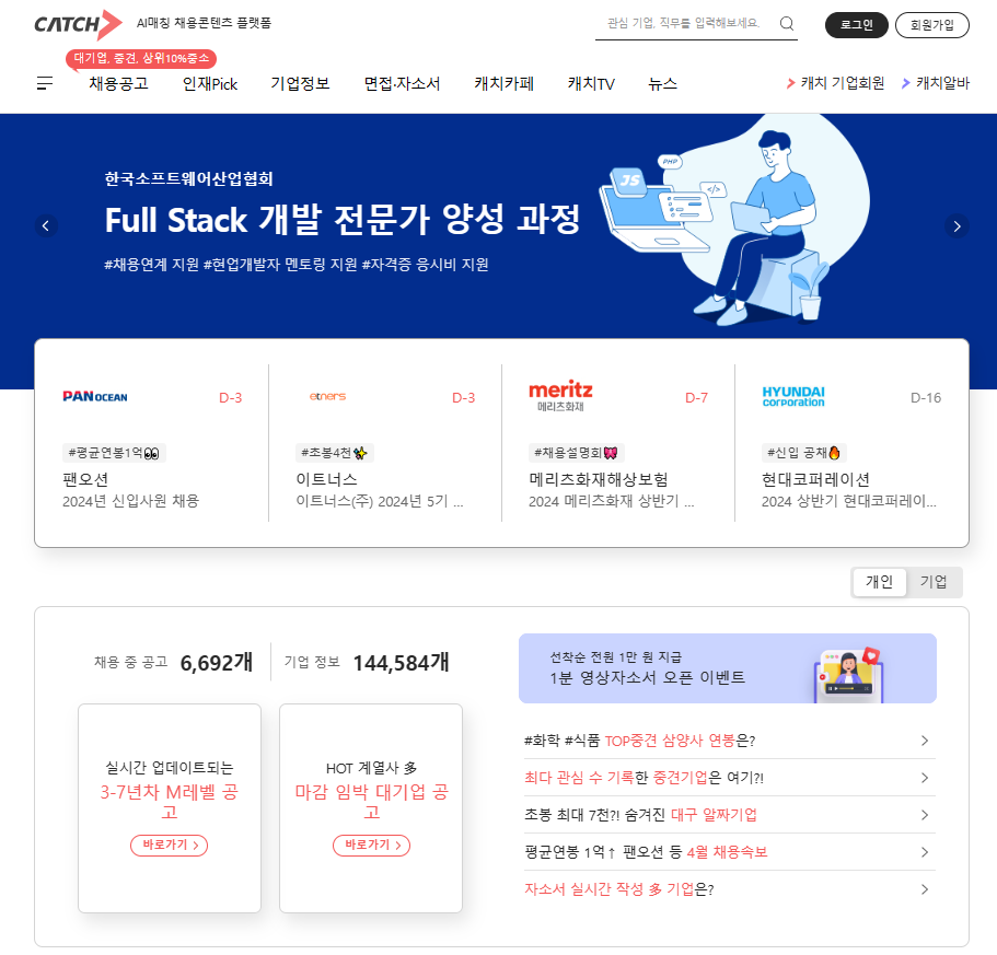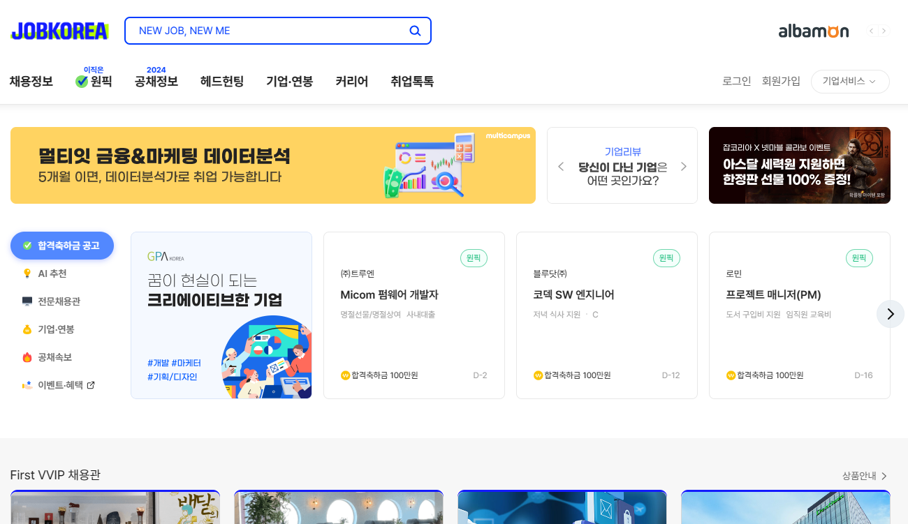 채용정보가 빠르게 올라오는 민간 취업포털 사이트 중 한 곳입니다. 채용공고를 신입직원에 인기가 있는 공고, 경력직원에 인기가 있는 공고, 오늘 뜬 인기 공고, 제조생산, 중견중소, 초봉 높은 기업 공고 등으로 분류해 제시하기 때문에 구직자 입장에서 새로운 시각으로 기업을 바라볼 수 있습니다.