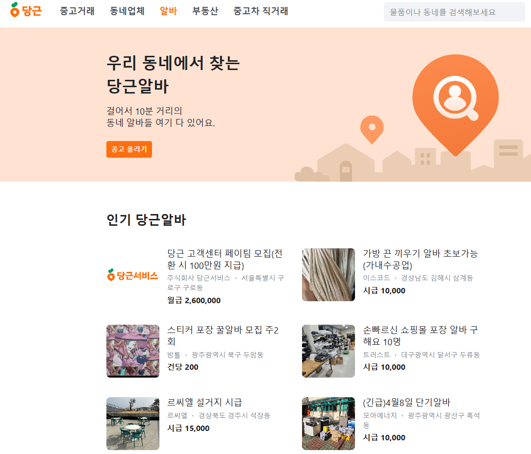 중고거래의 대명사가 돼 버렸죠. 당근입니다. 메뉴 중에 알바가 있는데, 단순히 알바가 아니라 집근처 회사들 중에 정규직 채용공고가 올라오는 경우가 적지 않습니다. 직주근접이 이뤄진 회사라면 출퇴근이 매우 용이하겠죠. 메이저 채용 사이트를 둘러본 후 추가적으로 당근도 살펴보면 의외의 소식을 접할 수도 있을 겁니다.