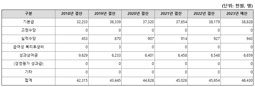 신입직원으로 입사했을 경우 평균연봉은 4500만 원이 될 것으로 보입니다. 올해는 4600만 원이 넘을 전망입니다. 성과상여금이 매년 600만원 중반 정도로 지급되고 있네요. 2018년에는 기본급이 적고 성과상여금(900만원)이 높았는데, 2019년부터는 성과상여금이 600만원 중반대로 유지되고 있는 모습입니다.
