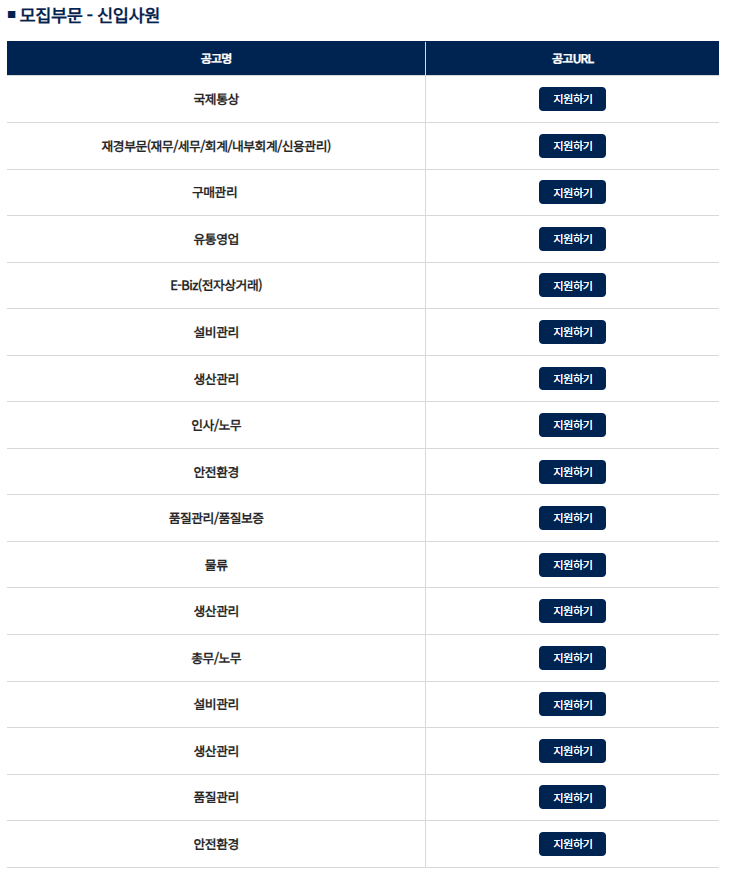 모집부문은 신입사원의 경우, 국제통상, 재경부문, 구매관리, 유통영업. e-biz, 설비관리, 생산관리, 인사 노무, 안전환경, 품질관리,품질보증, 물류, 생산관리, 총무 노무 등 다양합니다.