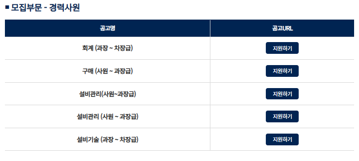 경력직은 사원부터 과장, 차장급까지 다양한 지급에서 채용을 진행하고 있습니다. 직무별로는 회계와 구매, 설비관리, 설비 기술 등입니다.