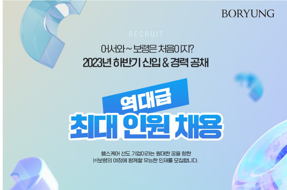 보령, 역대급 최대인원 채용 연봉은? 국내 최초로 글로벌 신약 카나브를 개발하고 항암제 부문 시장 점유율 1위인 보령이 대규모 채용에 나섭니다. 온라인 및 대학교 현장 채용설명회를 개최할 예정입니다. 모집일정과 채용 부문, 연봉은 어느 정도인지 알아보겠습니다. 아래 이미지를 클릭하면 채용 사이트로 이동하게 됩니다. 모집부문은 MR, 법무, 신제품기획, 인사 제약회사인 보령은 영업직인 MR(Medical Representative)과 영업외 인사지원그룹 법무팀 경력직, 인사팀 경력직, 신제품 기획팀 경력직 등을 채용합니다. MR은 대졸이상의 학력자로 전공은 무관합니다. 전문의약품 영업과 마케팅, 지역 병원과 의원 거래처를 관리하고 의약품 세미나도 진행합니다. 향후 사내 공모를 통해 마케팅, 개발 및 관리직..